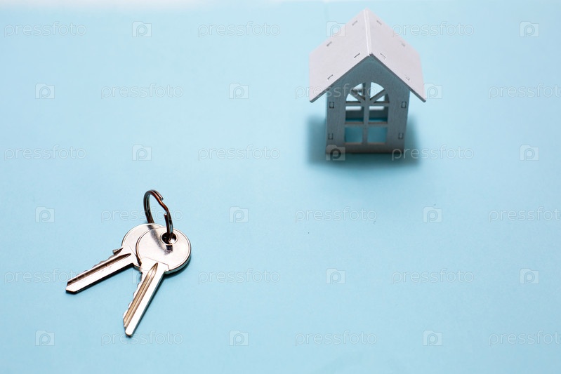 Символ белого деревянного дома и ключи на синем фоне. Концепция строительства коттеджа, планировка и дизайн, архитектурный план, переезд в новый дом, риелтор, готовый бизнес. Место для текста, ровно