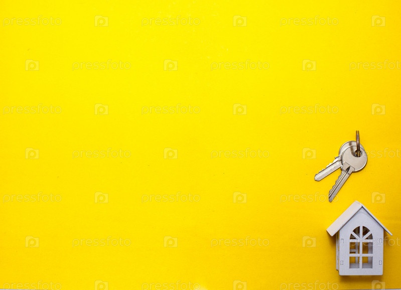 Символ белого деревянного дома и ключи на желтом фоне. Концепция строительства коттеджа, планировка и дизайн, архитектурный план, переезд в новый дом, риелторское агентство. Место для текста, ровно