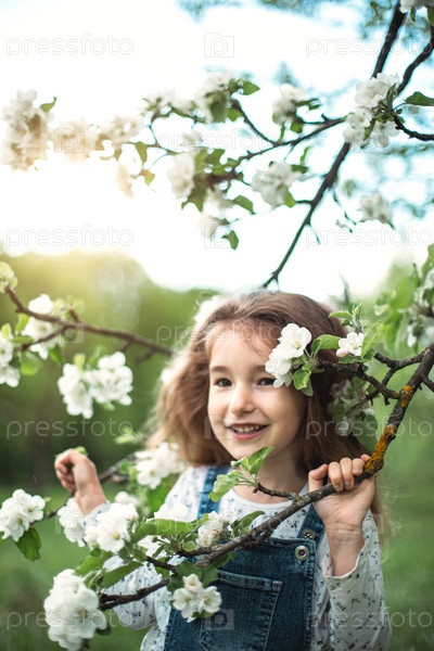 Милая маленькая девочка 5 лет в цветущем саду белой яблони весной. Весна, фруктовый сад, цветение, аллергия, весенний аромат, нежность, забота о природе. Портрет