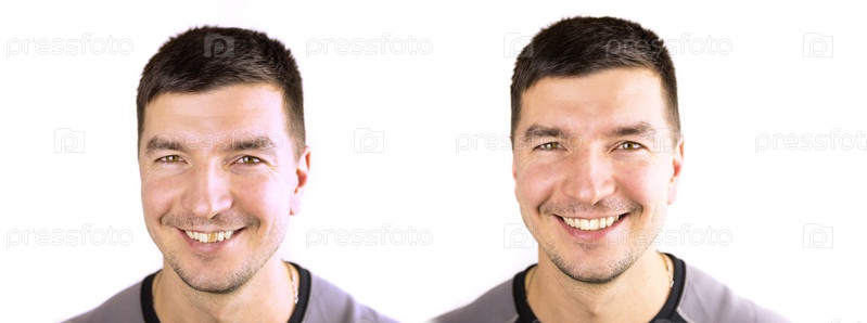 Желтый поврежденный зуб крупным планом. До после. Сосредоточьтесь на зубах. Стоматологические проблемы, мертвые зубы, отбеливание эмали, эстетическая реставрация. Натуральная эмаль, позитив на теле