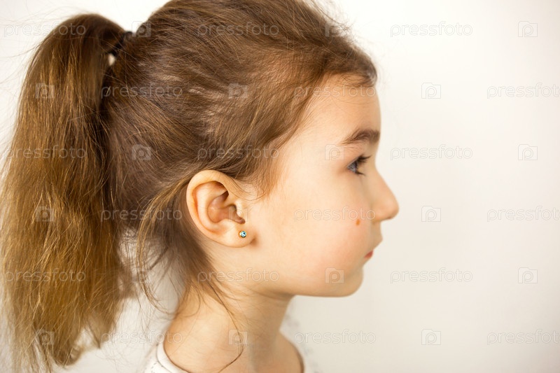 Прокалывание ушей у ребенка - девочка показывает сережку в ухе из медицинского сплава. Белый фон, портрет девушки с родинкой на щеке в профиль
