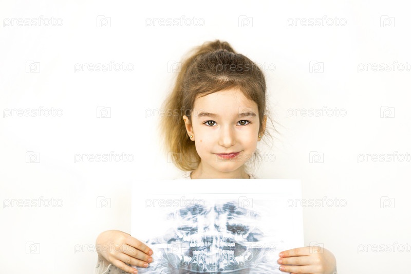 Девушка держит свой рентгеновский снимок с панорамой молочных зубов и второго ряда сменных коренных зубов. Два ряда зубов, смена на постоянные зубы. Медицинская и детская стоматология, ортодонтия