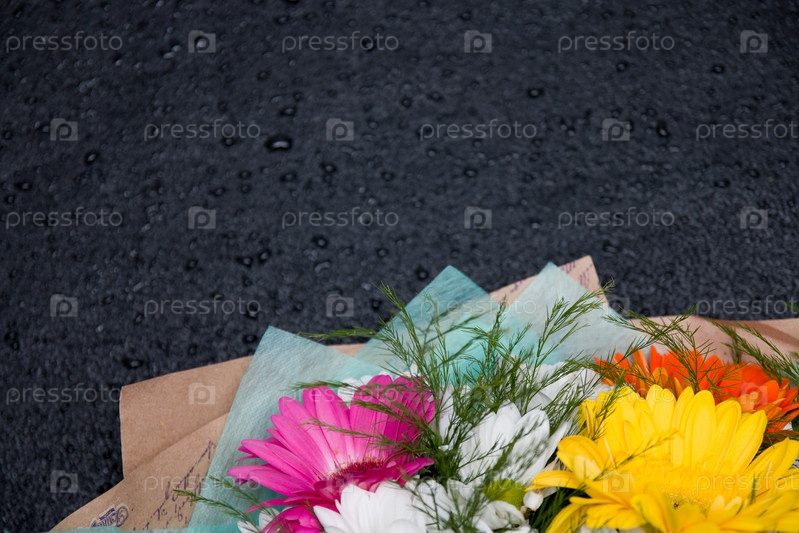 Букет гербер на черном фоне место копия желтый зеленый розовый белый оранжевый вид сверху капли воды мокрые