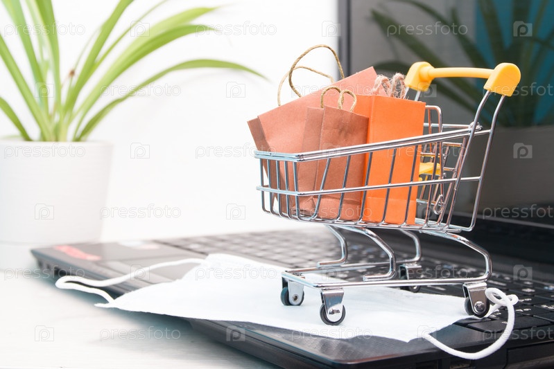 Миниатюрная тележка для покупок на черной подставке для ноутбука, маленькие бумажные пакеты в тележке, место для копирования, интернет-магазины во время пандемии коронавируса 2020, цветок в горшке на заднем плане
