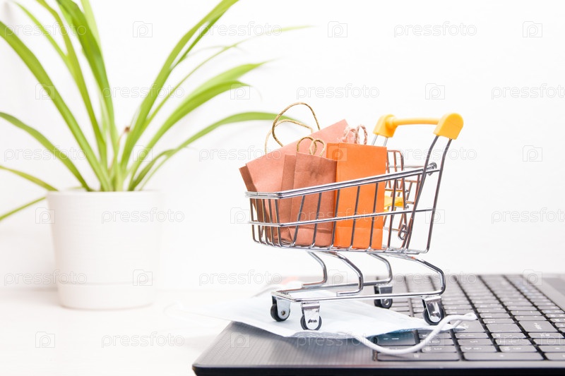 Миниатюрная тележка для покупок на черной подставке для ноутбука, маленькие бумажные пакеты в тележке, место для копирования, интернет-магазины во время пандемии коронавируса 2020, цветок в горшке на заднем плане