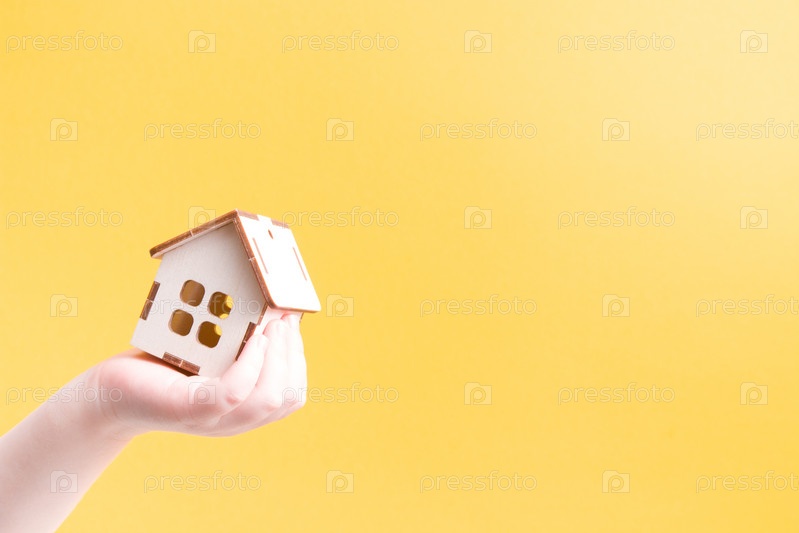Детская рука держит маленькую модель деревянного дома, желтый фон, пространство для копирования