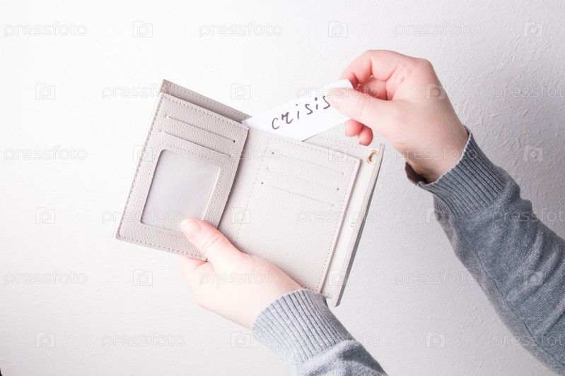 Женщина дает бумагу с надписью кризис, место для копирования, бежевый кожаный кошелек и небольшой лист бумаги, белый фон, пустой кошелек и отсутствие денег