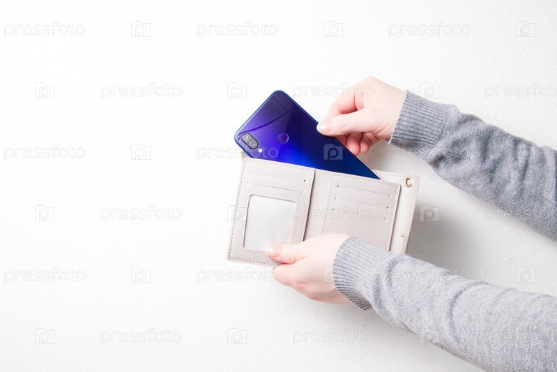 Женская рука берет смартфон из кошелька. белый фон, место для копирования, электронные деньги, концепция онлайн-покупок, телефон, используемый для оплаты покупок и услуг
