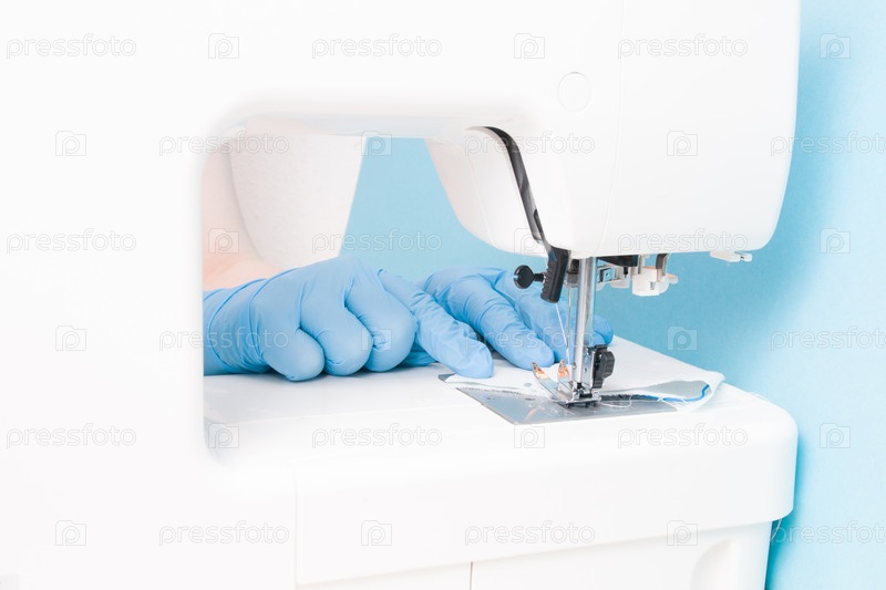 Женщина в синих одноразовых медицинских перчатках шьет на швейной машине защитную маску для лица из хлопчатобумажной серой ткани, синий фон, процесс шитья масок