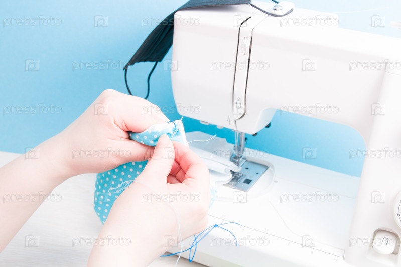 Женщина шьет иглой защитную маску для лица из хлопчатобумажной ткани, концепция ручного шитья, швейная машина и маска на заднем плане, синий фон, концепция защиты от вирусов, процесс шитья