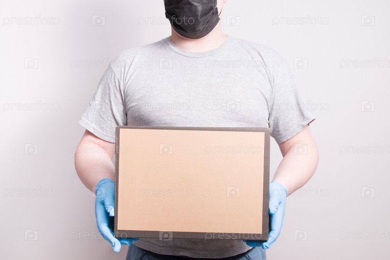 Мужчина в черной защитной маске на лице в серой футболке в синих резиновых одноразовых перчатках держит коробку из гофрокартона, светлый фон, бесконтактная доставка, карантин 2020