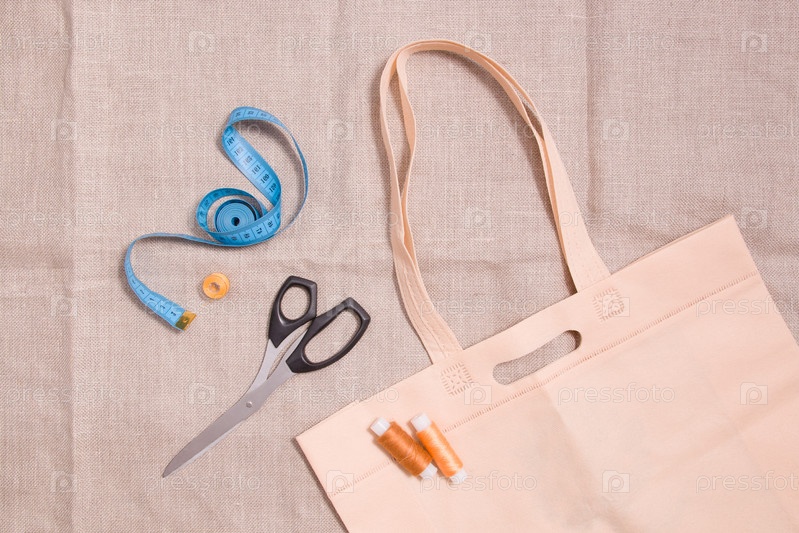 Эко-сумка, ножницы, измерительная лента и несколько катушек ниток на льняной ткани, вид сверху, место для копирования, сумка для покупок из швейной ткани