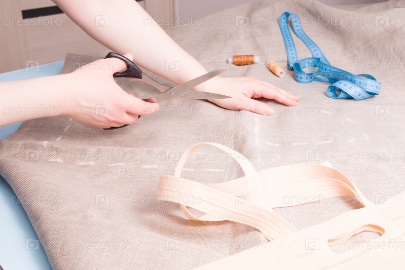 Женщина держит ножницы, чтобы разрезать белье, сшить тканевую сумку для покупок из льна, выкройку сумки, контурную сумку с мелом на ткани, измерительную ленту, нить, пространство для копирования, экологически чистый образ жизни