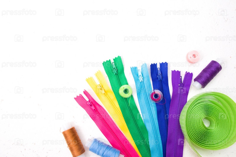 Яркие красочные молнии, нитки в разных катушках, липучки в рулоне лежат на белом фоне копией пространства, вид сверху, рамка из швейных принадлежностей