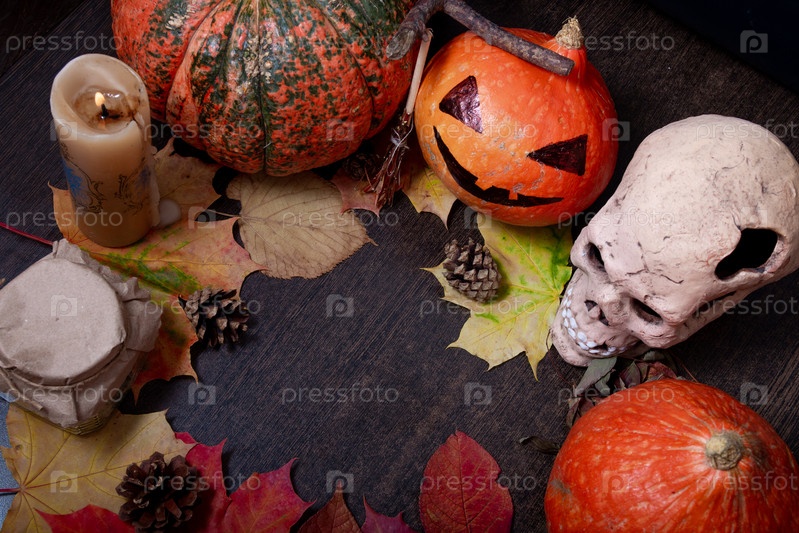 Темный декор хэллоуина, череп, тыквы, горящая свеча, сухие осенние листья, шишки и декоративная метла на темно-коричневом деревянном столе, копия пространства, вид сверху, зловещая атмосфера хэллоуина