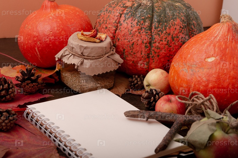 Уютный натюрморт с банкой чая, осенние фрукты и овощи, сухие яблоки, ветка, осенние листья, лечение холодом осенью, оранжевые цвета, блокнот, место для копирования, осеннее настроение, хэллоуин, день благословения, сезонная тема
