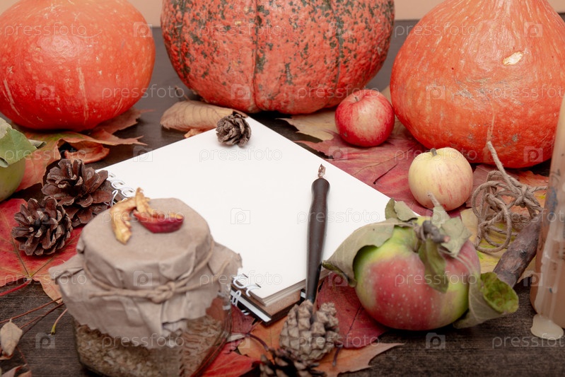 Банка чая из тетради, осенние фрукты и овощи на коричневом деревянном столе, сухофрукты, яблоки, тыквы, осеннее настроение, здоровое, пространство для копирования, шишки и ветки, осенняя композиция, оранжевый, красный, желтый, уютный натюрморт, белый лист