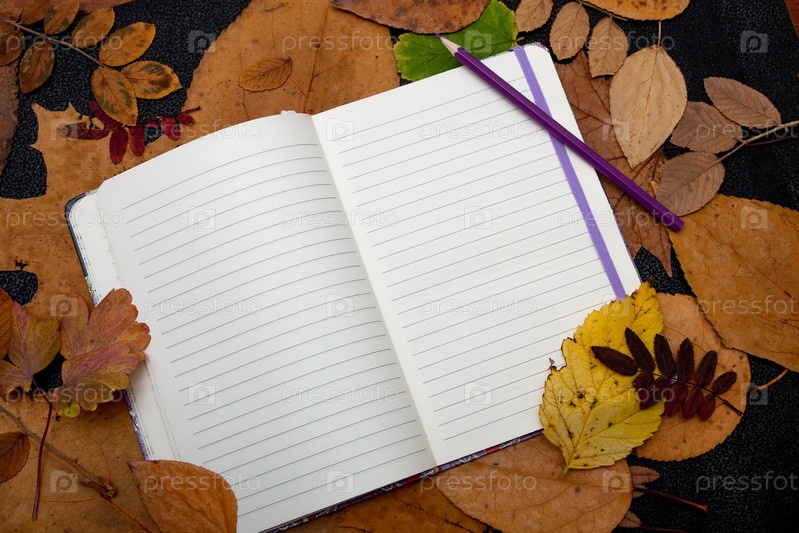 Пустой блокнот сиреневый карандаш и синий карандаш на сухих осенних листах желтые цвета красный оранжевый природа задний фон вид сверху копировать пространство список дел