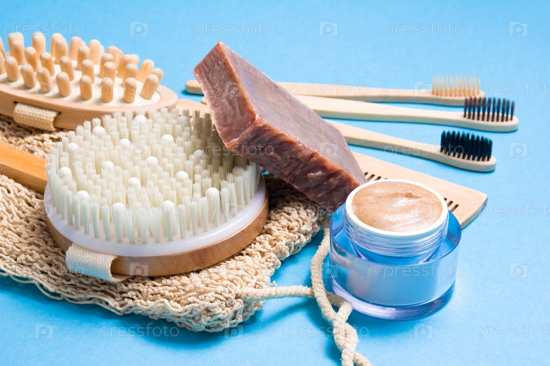 Бамбуковые зубные щетки, деревянная расческа, вязаная мочалка, натуральный домашний скраб в банке и домашнее мыло и щетка для сухого массажа на синем фоне, копия пространства, экологически чистый набор