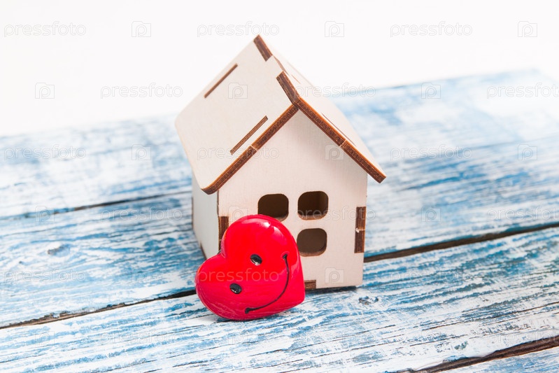 Модель небольшого деревянного дома и сердце на синем деревянном фоне, пространство для копирования