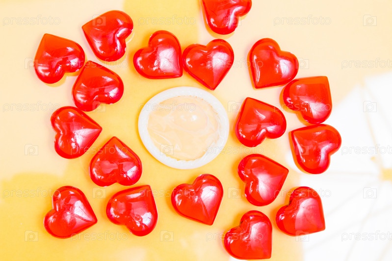 Презерватив и много маленьких стеклянных красных сердечек желтый фон, концепция защищенного секса, секс для любви между любовниками, отражение в стекле