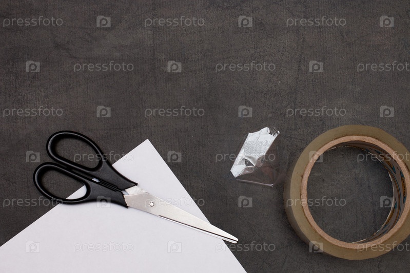 Ножницы скотч и белая прозрачная бумага на черном фоне стола копией пространства