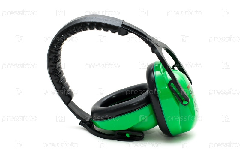 Зеленые рабочие защитные наушники, изолированный наушник на белом фоне