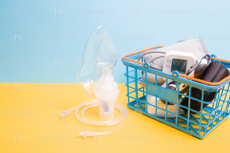 Насадка для ингаляций лежит на желто-синем фоне; в небольшой синей корзине для покупок измеряют артериальное давление, глюкометр и небулайзер для ингаляций; копировать пространство; концепция аптеки