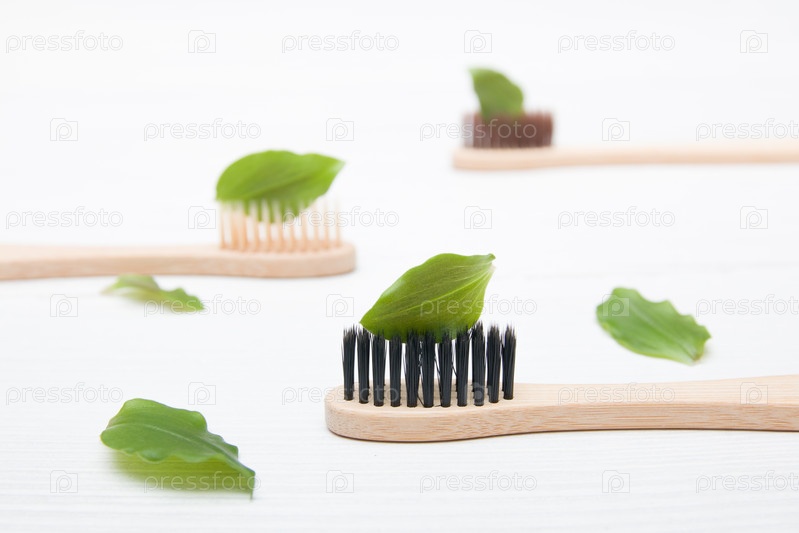 Бамбуковые щетки с лепниной на светлом фоне, лист на щетке, как зубная паста, концепция нулевых отходов, натуральная косметика