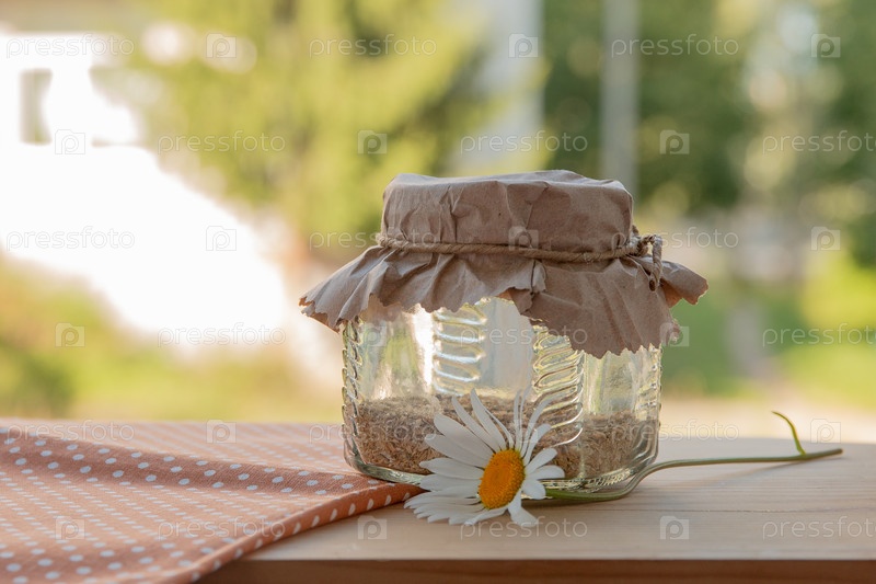 Стеклянная банка с ромашковым чаем на окне коричневая ткань в горошек деревянный подоконник зеленый фон вид из окна копия пространство природа натуральный ингредиент для здоровья