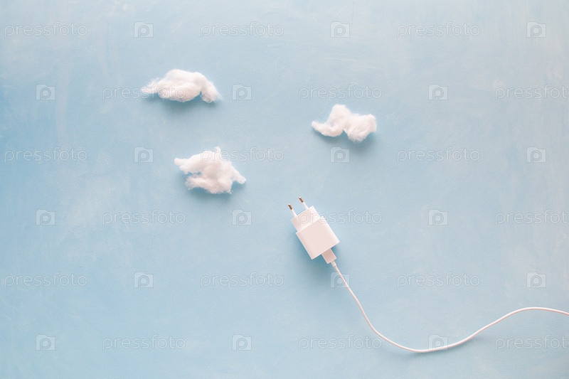 Зарядное устройство с кейлом на синем фоне с облаками хлопка, концепция энергосбережения, экономия энергии, трата денег на электричество, копирование пространства