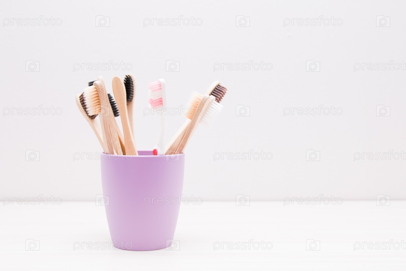 Пластиковая щетка в стакане с бамбуком, безотходный конец, проблемы переработки и загрязнения, пространство для копирования