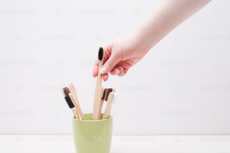 Женская рука берет бамбуковую щетку из стакана с несколькими щетками, экологически чистая концепция, ноль отходов