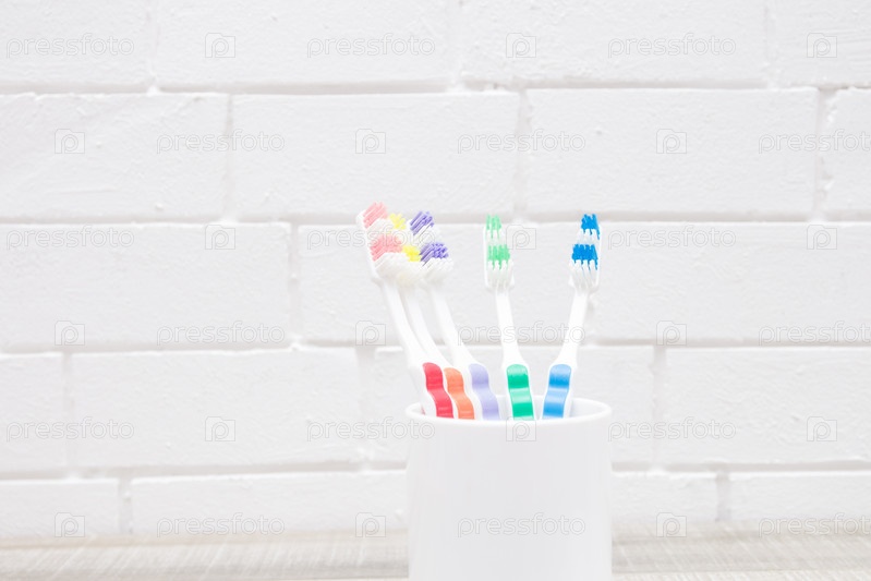 Зубные щетки в стакане на светлом фоне кирпичной стены, ванная комната, чтение зубов, уход за полостью рта, семейная концепция