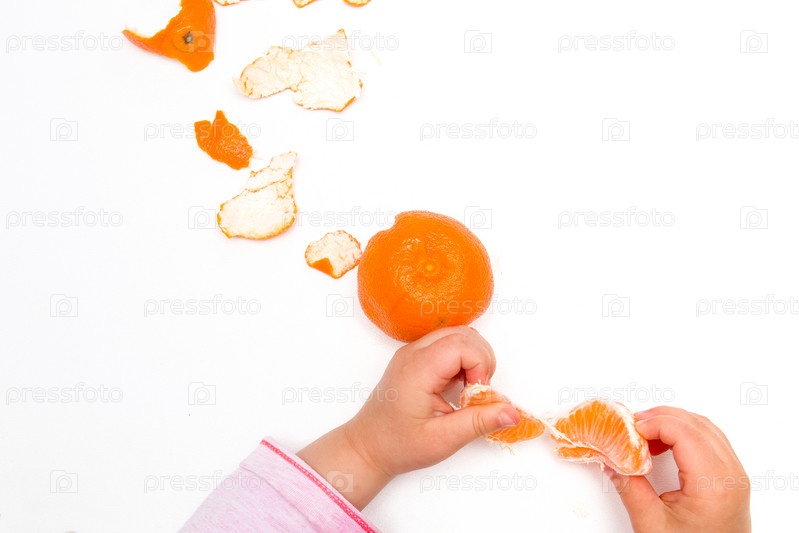 Детские руки делят мандарин на дольки на белом фоне розовый апельсин