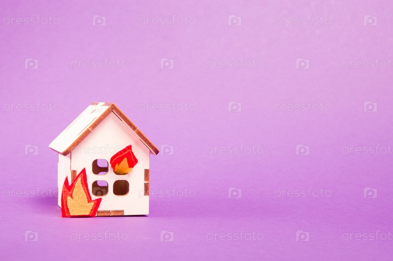 Горящая деревянная модель дома, огонь, вырезанный из войлока, пространство для копирования фиолетового фона, страхование и защита концепции недвижимости, поджог дома, легковоспламеняющийся материал