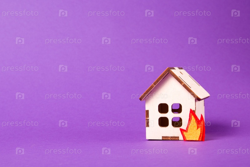 Горящая деревянная модель дома, огонь, вырезанный из войлока, пространство для копирования фиолетового фона, страхование и защита концепции недвижимости, поджог дома, легковоспламеняющийся материал