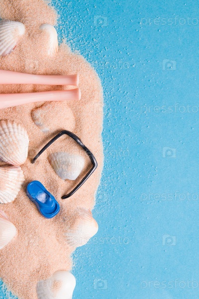 Песок, ракушки и ножки куклы на синем фоне, пространство для копирования, аксессуары для игрушек, очки и пляжная обувь, пляжный отдых, не выходя из дома, концепция отдыха