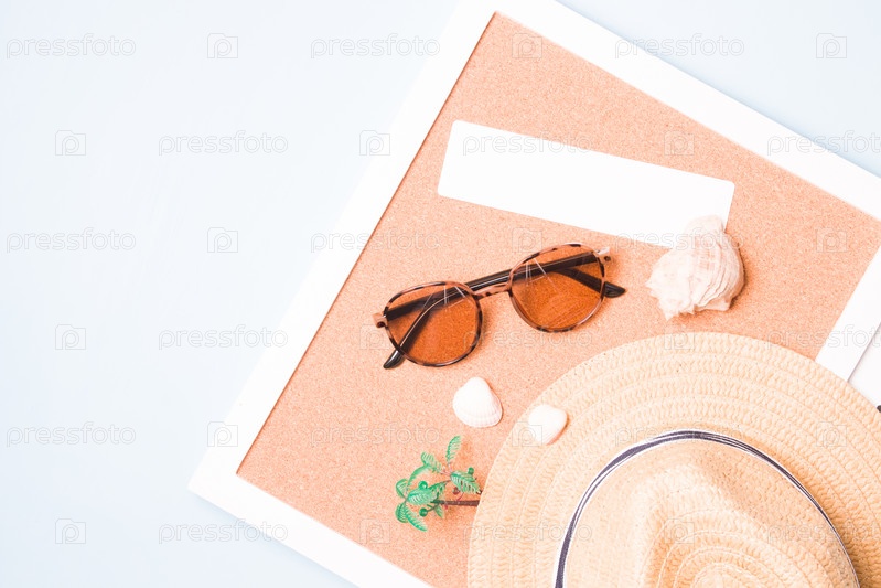 Соломенная шляпа, игрушечная пальма, солнцезащитные очки, ракушки и картонный прямоугольник для вашего текста на пробковой доске, голубой фон, пространство для копирования, вид сверху, концепция пляжного отдыха