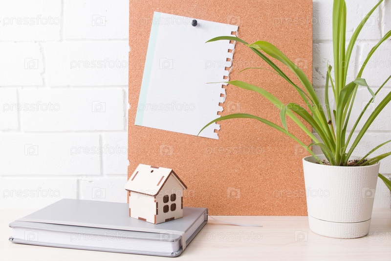 Рабочее место на самоизоляции, пробковая доска, цветок и блокнот на фоне загадочной стены, модель дома на столе, место для копирования, учеба и работа дома