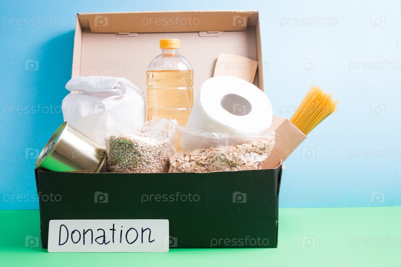 Надпись о пожертвовании на белой картонной коробке, коробка с едой на сине-зеленом фоне, место для копирования, туалетная бумага, спагетти, растительное масло, крупы, консервы