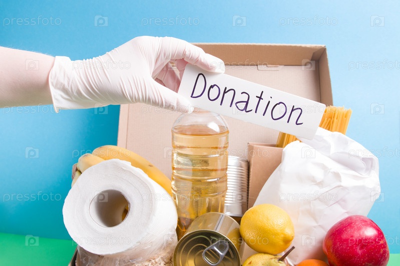 Рука в белой резиновой перчатке кладет белую картонную коробку с надписью о пожертвовании в коробку с едой на сине-зеленом фоне, помогает при пандемии коронавируса, волонтерская концепция