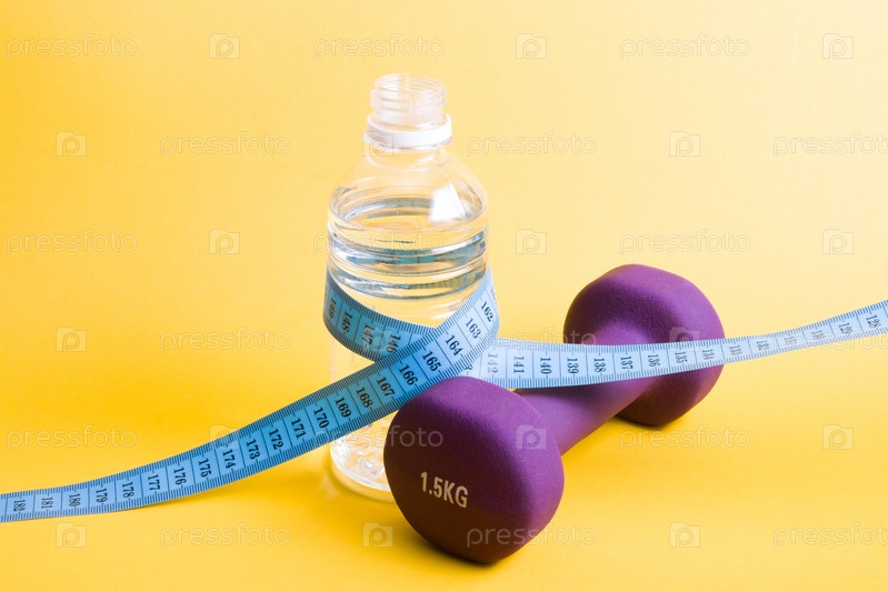 Бутылка воды, обернутая измерительной лентой и филейной гантелью на желтом фоне, пространство для копирования, здоровый образ жизни, социальная концепция, потеря веса и концепция питьевой воды