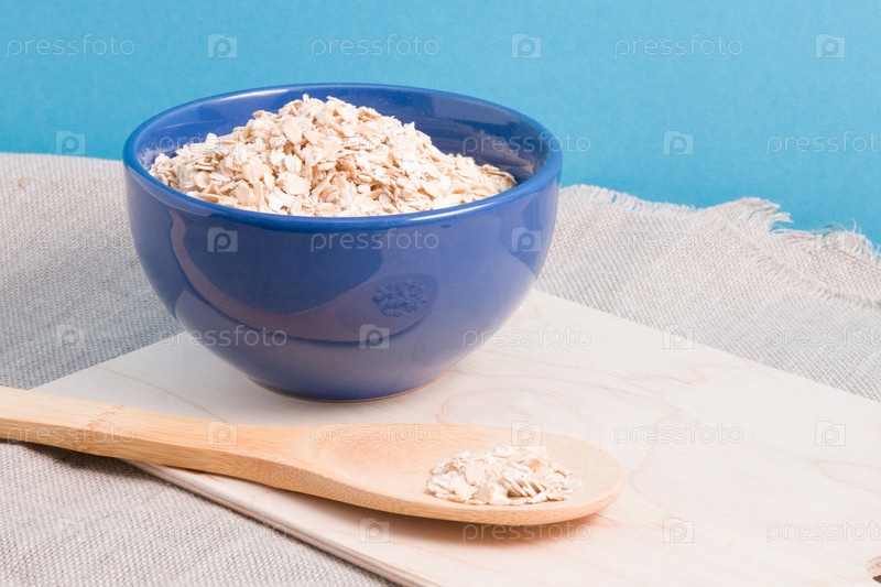 Овсянка в синей миске и деревянная больная ложка на столе, синий фон, пространство для копирования, разделочная доска и постельное белье на столе