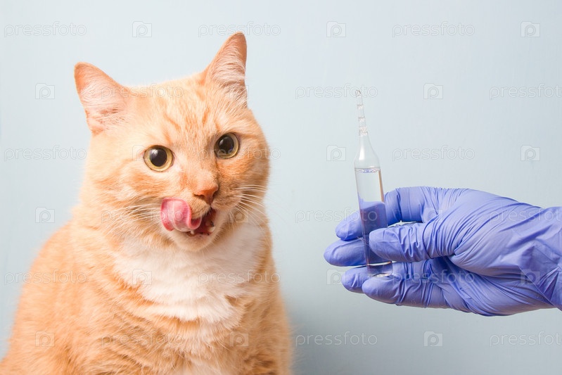 Милый рыжий кот и рука в синей резиновой одноразовой перчатке с ампулой с лекарством или вакциной, концепция ветеринарной клиники, лижет кошку на синем фоне