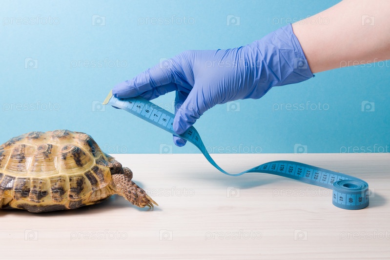 Рука в синей резиновой одноразовой перчатке измеряет рулеткой панцирь наземной черепахи, синий фон место шахты, кабинет герпетолога