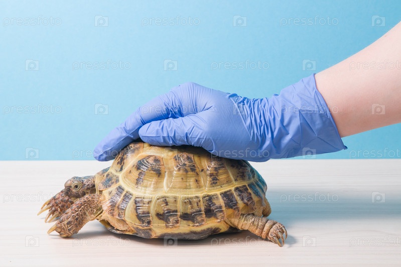 Ветеринар-герпетолог положил руку в перчатке на панцирь наземной черепахи, чтобы успокоить ее и удержать, любовь к рептилиям, помощь и лечение рахита у черепах