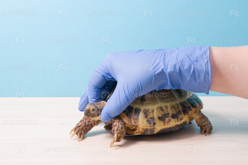 Рука ветеринара в перчатке держит голову наземной черепахи для осмотра, лечения совков, кабинета герпетолога, деревянного стола на синем фоне
