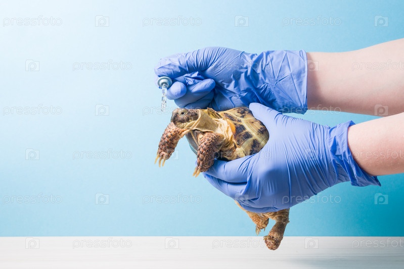 Ветеринар-герпетолог дает каплю лекарства из пипетки наземной черепахе, рука в резиновой перчатке с пипеткой для капли для лечения черепах, синий фон, пространство для копирования
