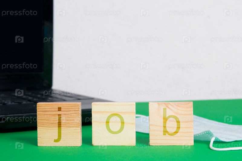 Деревянные блоки со словами Работа, белый фон для текста, зеленый стол и защитная медицинская маска рядом с ноутбуком, нетворкинг, удаленная работа, найти новую работу во время карантина